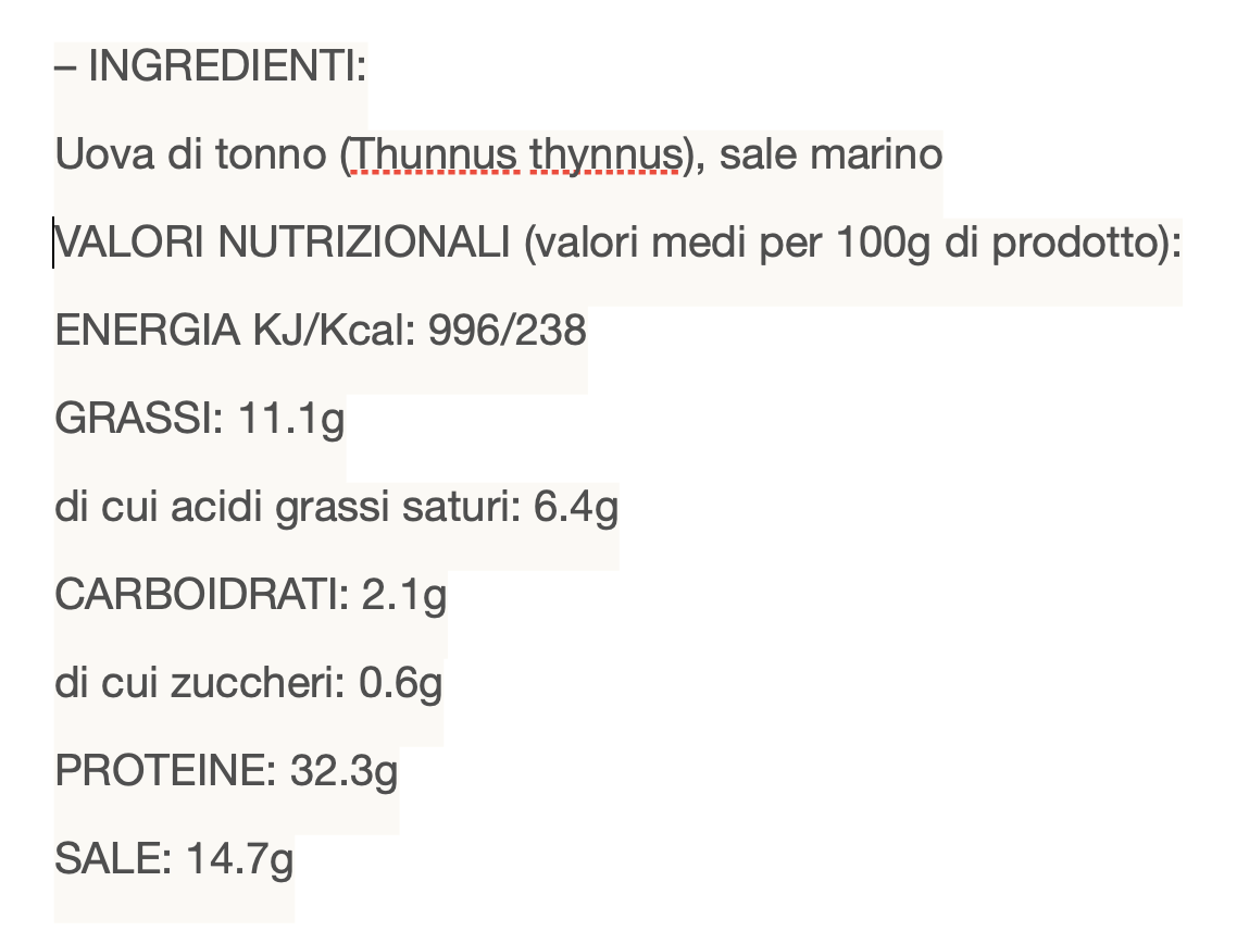 La variété de cette sélection est appelée thon Bluefin, qui est la meilleure qualité de Baffa - moyen - grand , capturé dans la mer Méditerranée. Couleur rose claire. Reconnaitre la qualité de la Poutargue de thon n'est pas facile . Nous allons vous guider dans un voyage à travers trois variétés précieuses et de qualité de poutargue de thon avec des goûts différents et des prix différents, en fonction du plat que vous allez cuisiner. Dans ce cas, nous parlons de Poutargue de thon rouge de la Méditerranée , la meilleure, à peine moins que le 1er choix . Essayez-la coupèe finement sur la burrata de la fromagerie Olanda, ou sur une pizza blanche en flocons et avec un peu d'huile d' olive . Une vraie bonté ....!